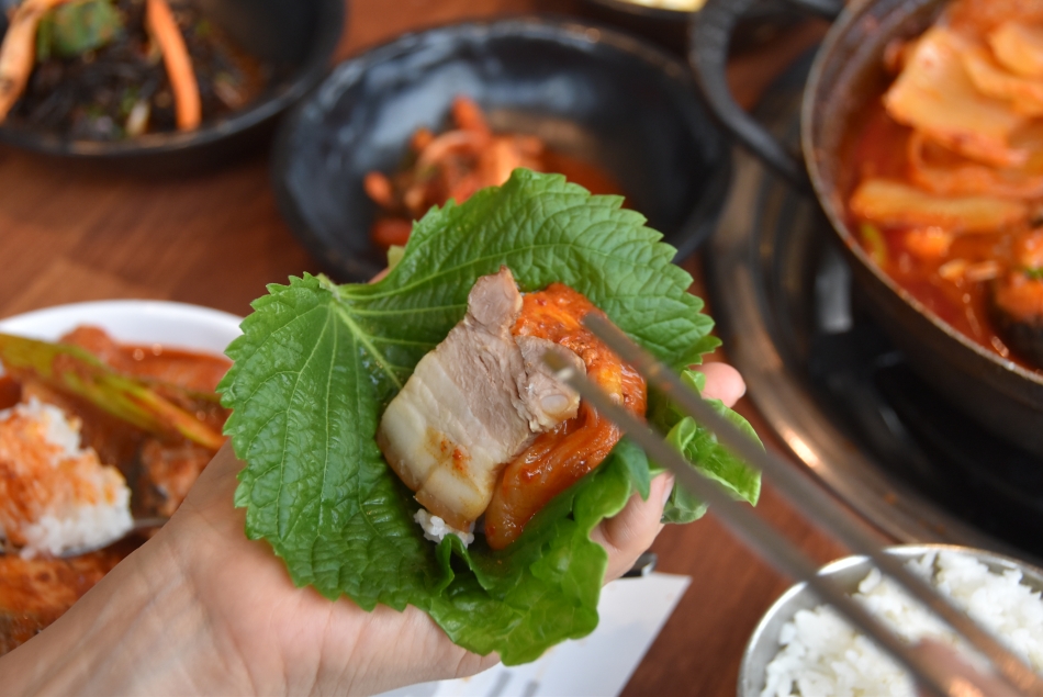 쌈채소에 밥을 올리고 갈치속젓, 돔베고기를 곁들여 먹으니 꿀맛입니다. 보쌈 전문점 못지 않은 맛입니다.