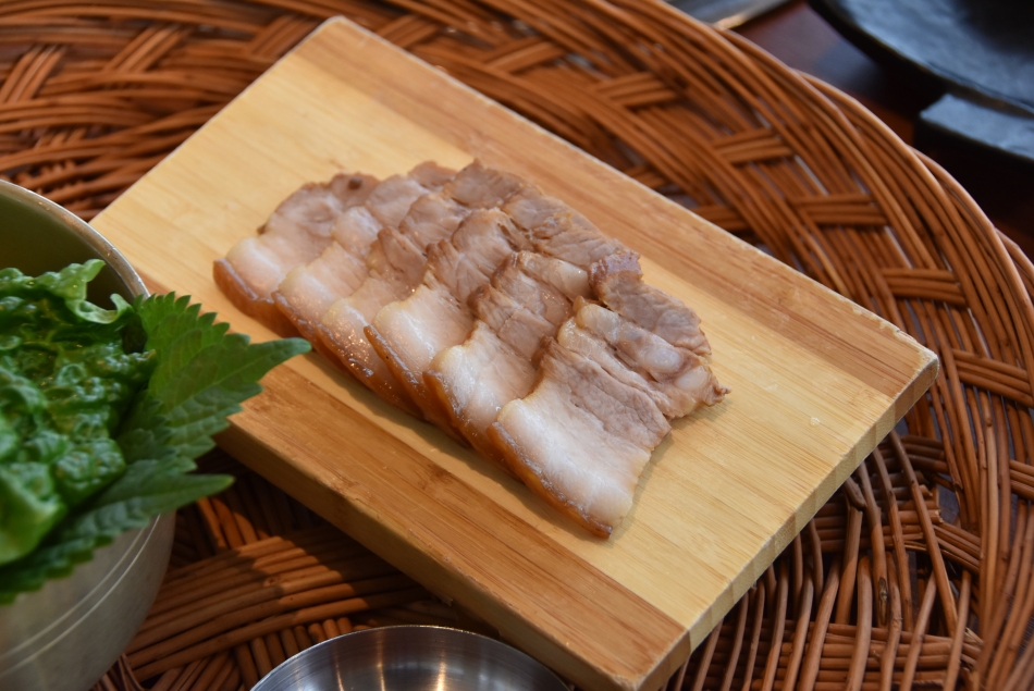 메인 요리에 함께 나오는 찬 중에는 돔베고기가 단연 돋보였습니다. 오겹살로 추정되는 수육에 갈치속젓, 쌈장, 쌈채소가 곁들여 나오는데 정성스런 플레이팅이 인상적이었습니다.